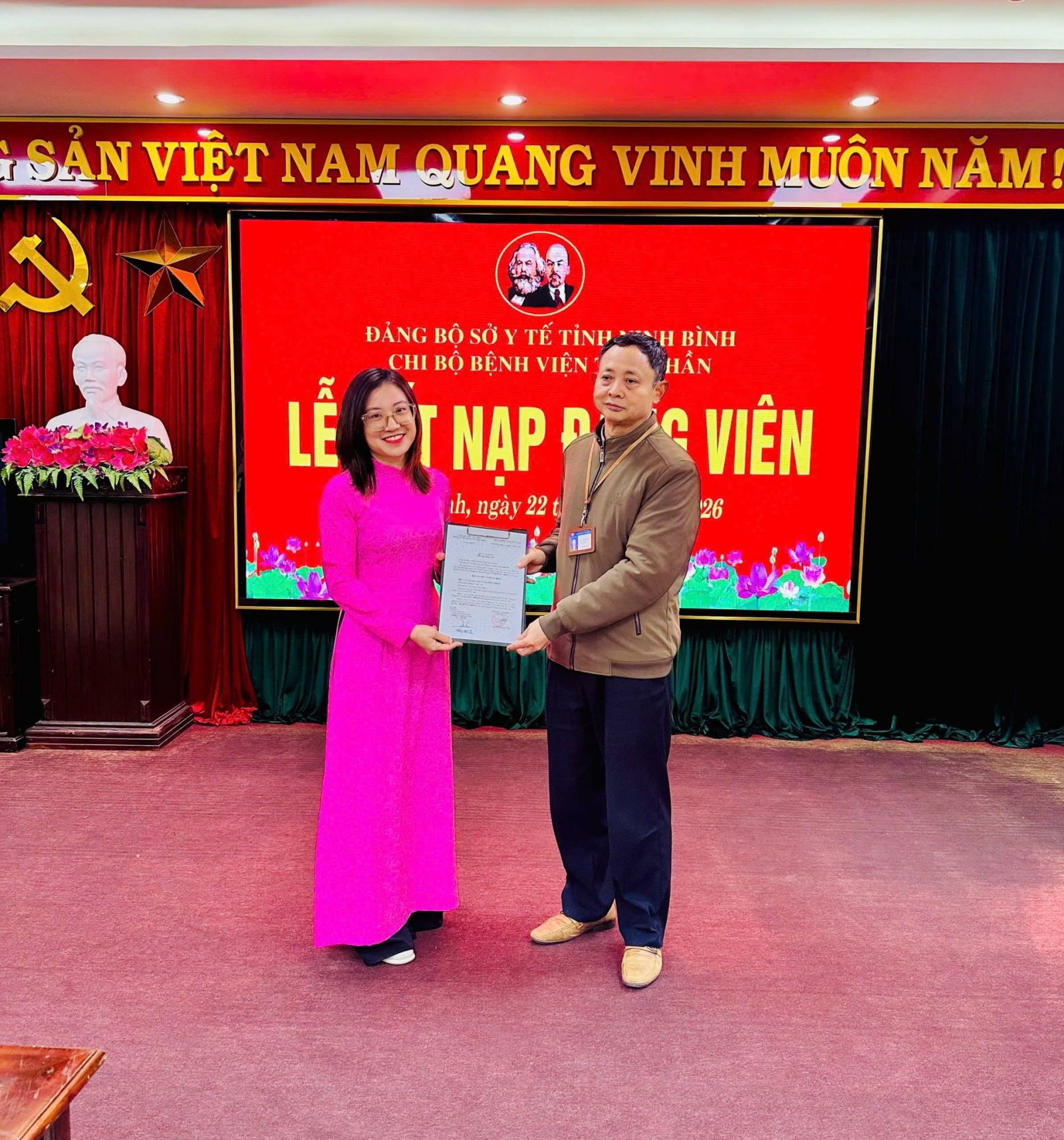 Chiều nay, ngày 22/01/2026, trong không khí trang nghiêm và phấn khởi, Chi bộ Bệnh viện Tâm thần tỉnh Ninh Bình đã long trọng tổ chức Lễ kết nạp Đảng viên mới cho quần chúng ưu tú: