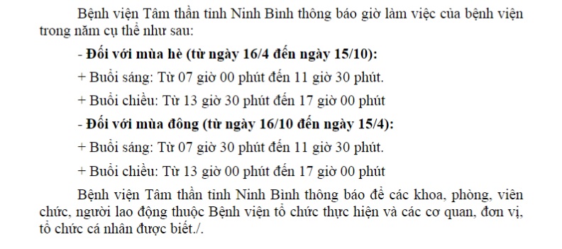 Thứ 2, 05/01/2026 | 16:48 A- A A+ | Thông báo giờ làm việc tại Bệnh viện Đọc bài Lưu Thông báo giờ làm việcthông báo giờ làm việc tại bệnh viện Tâm thần tỉnh Ninh Bình.pdf Tổng số điểm của bài viết là: 0 trong 0 đánh giá Click để đánh giá bài viết