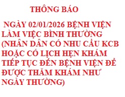 NGÀY 02/01/2026 BỆNH VIỆN LÀM VIỆC BÌNH THƯỜNG (NHÂN DÂN CÓ NHU CẦU KCB HOẶC CÓ LỊCH HẸN KHÁM TIẾP TỤC ĐẾN BỆNH VIỆN ĐỂ ĐƯỢC THĂM KHÁM NHƯ NGÀY THƯỜNG)