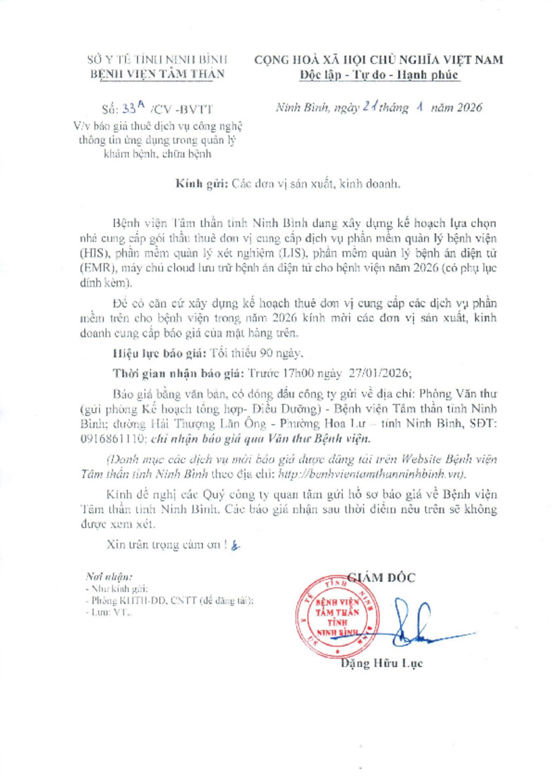 | Tiêu đề văn bản | Công văn mời báo giá thuê dịch vụ CNTT trong công tác quản lý khám chữa bệnh | ||